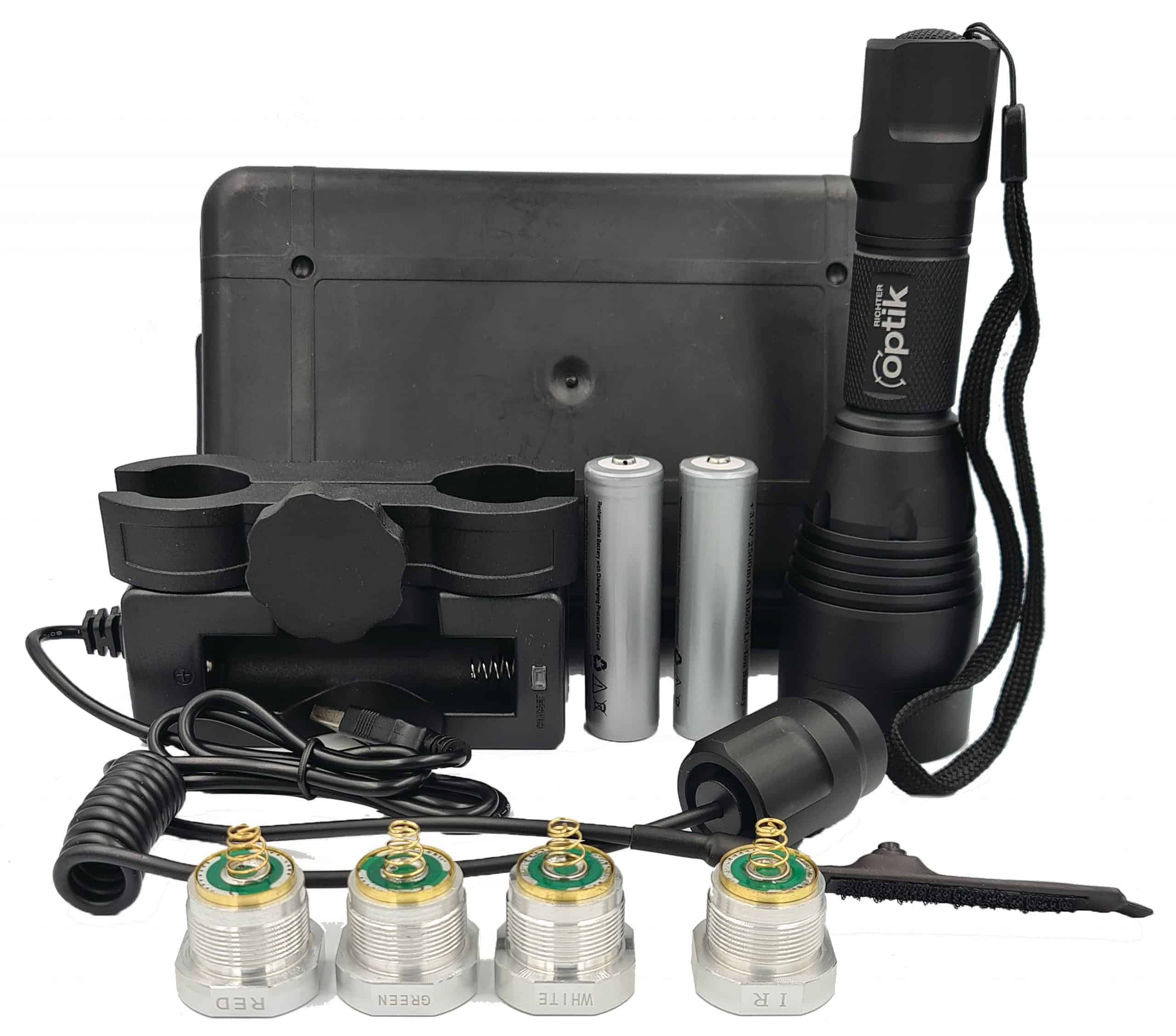 The Kit comes in an attractive ABS carry/storage case. It includes the gun light unit, pressure switch with velcrotab, standard switch, universal mount, two 18650 rechargeable batteries, battery charging cradle and four interchangeable LED modules; red, green, white and IR for night vision use.
